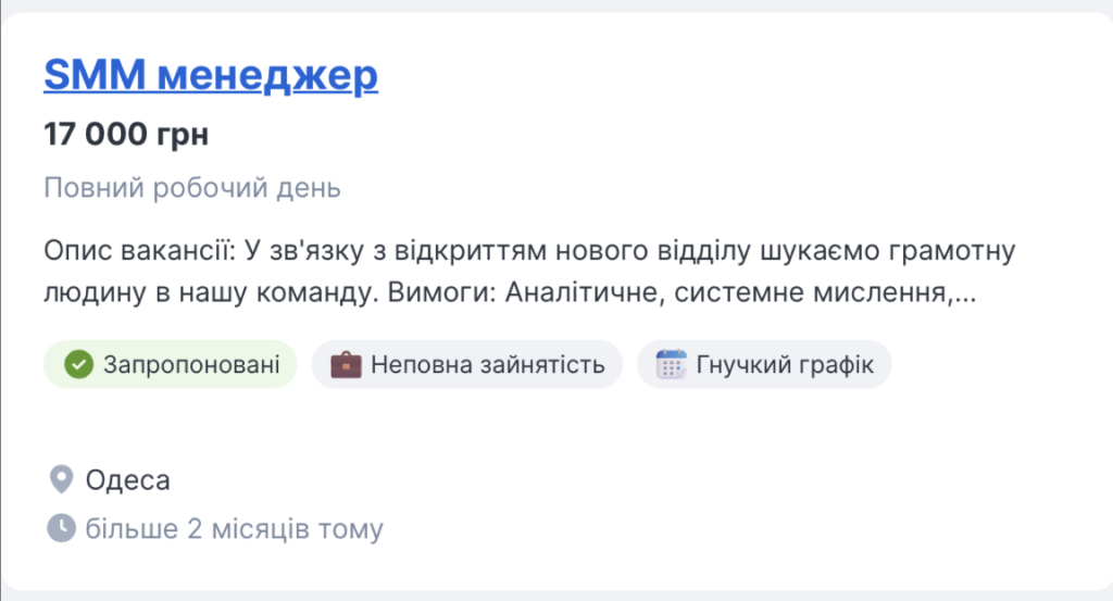Заробітна плата початківця SMM-менеджера становить близько $300 на місяць, а досвідчені спеціалісти можуть заробляти до $800.